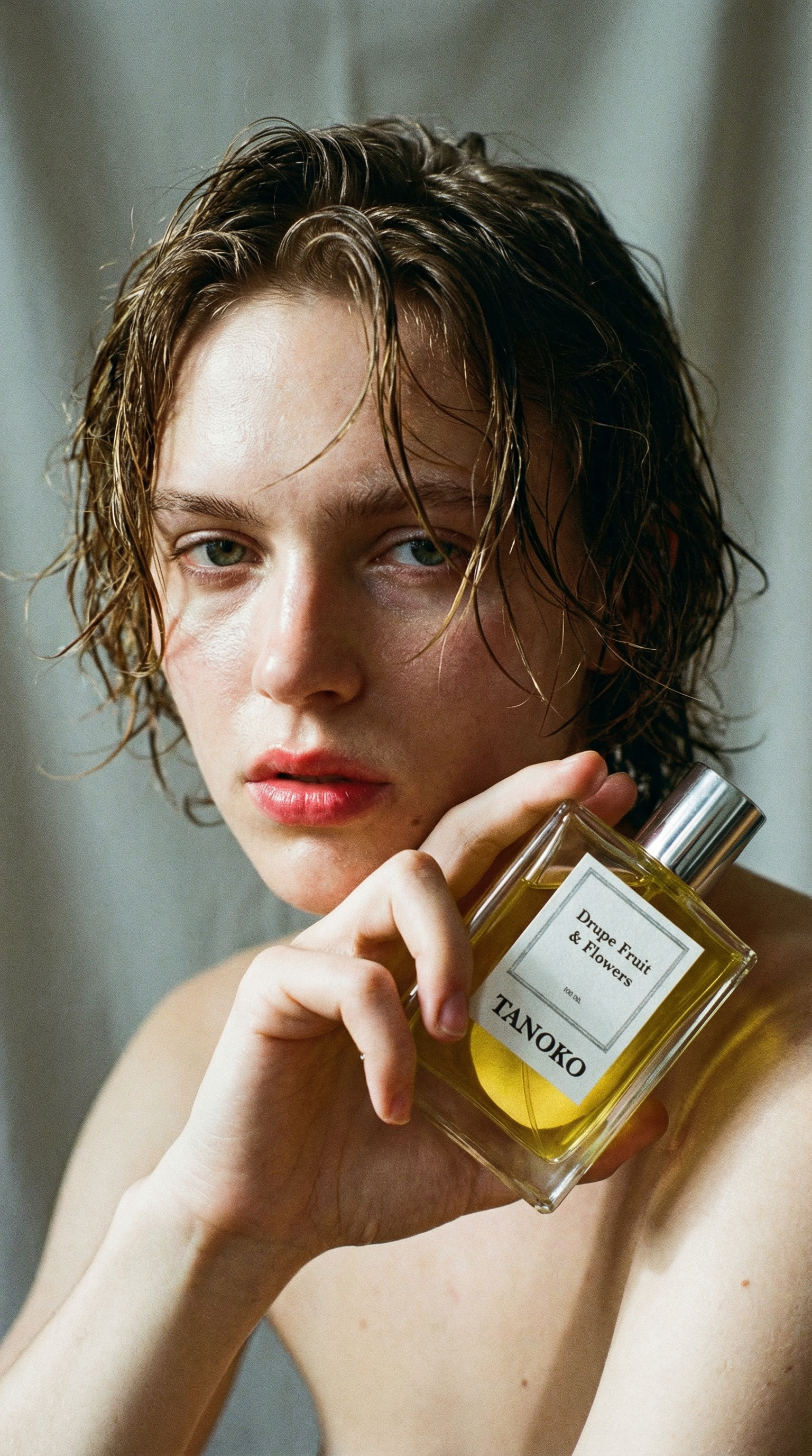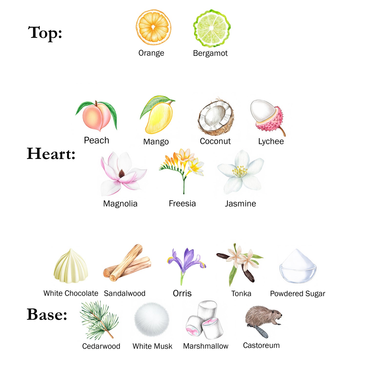 The floral heart is composed of transparent white flowers. The overall impression is milky and lactonic, featuring coconut, peach, jasmine, and a hint of tuberose.